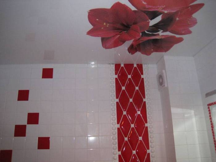 Маленький санузел лучше всего оборудовать натяжным потолком. Он не боится влаги, не требует выравнивания и очистки.