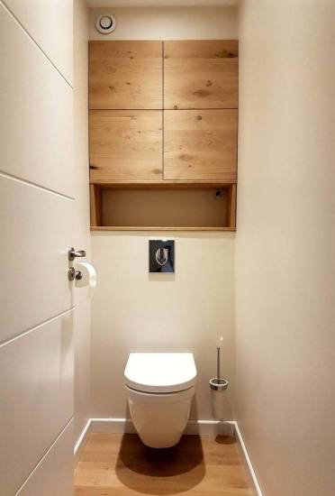 Однако встречаются и обратные ситуации: что делать, если помещение туалета слишком большое? Оптимальный выход – приобретение функциональной и стильной мебели для ванной и туалетной комнат, разработанной специально для таких помещений. Это высокие шкафы для моющих средств, шкафчики для туалетных принадлежностей или полки для ароматизаторов – выбор зависит от предпочтений владельцев квартиры.