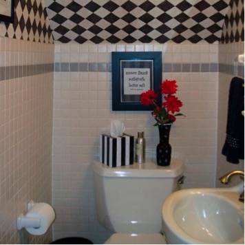 Если помещение туалета имеет вытянутую форму и небольшой размер, напоминая по форме туннель, то потребуется грамотно зонировать и зрительно его разделить. Для этого рекомендуется применить горизонтальное зонирование. Прекрасно для такой цели подойдут рисунки по периметру помещения, которые могут быть выполнены как деталь отделочного материала (например, керамическая плитка контрастных цветов) или вставки иного вида отделки.
