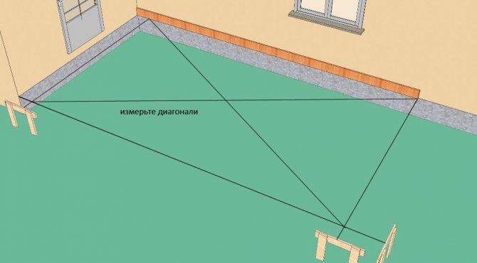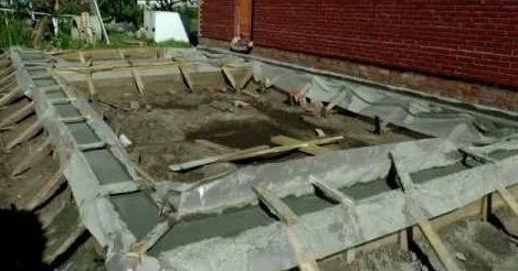 Для сооружения отмостки следует снять слой грунта 10-20 см на указанную ширину по всему периметру веранды, установить по внешнему краю подготовленной площадки деревянную опалубку высотой 7-10 см с небольшим уклоном от стены.