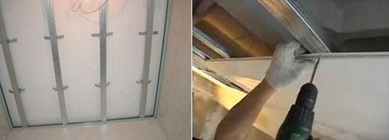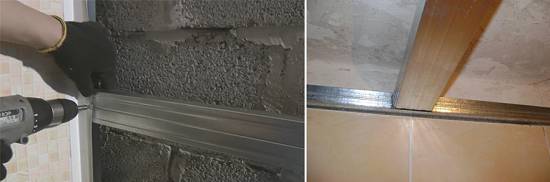 Отделка потолка ПВХ-панелями выполняется аналогично. Сначала фиксируют профиля по периметру комнаты, а затем поперечные L-образные детали. Далее производится монтаж панелей, предварительно вырезав в них отверстия под потолочные светильники.