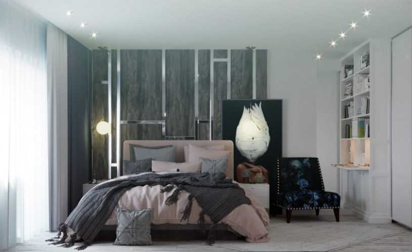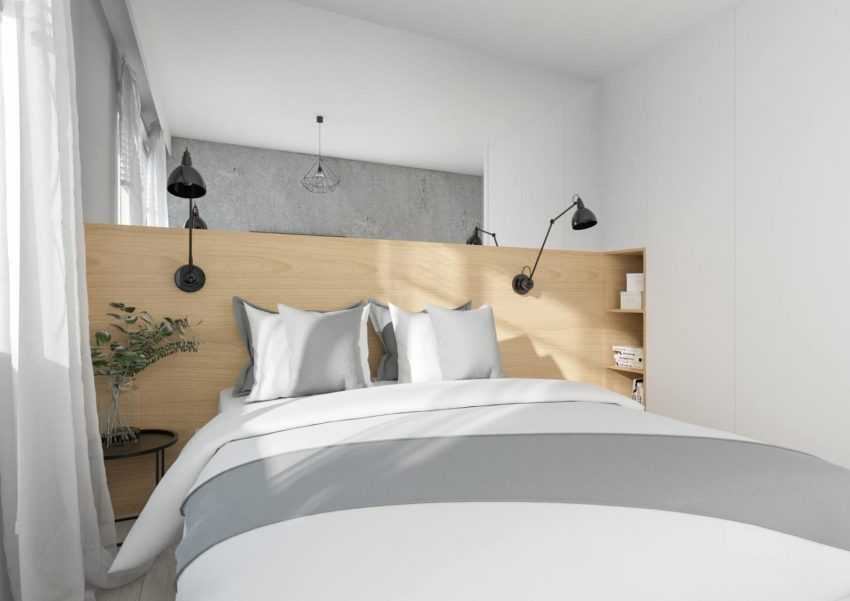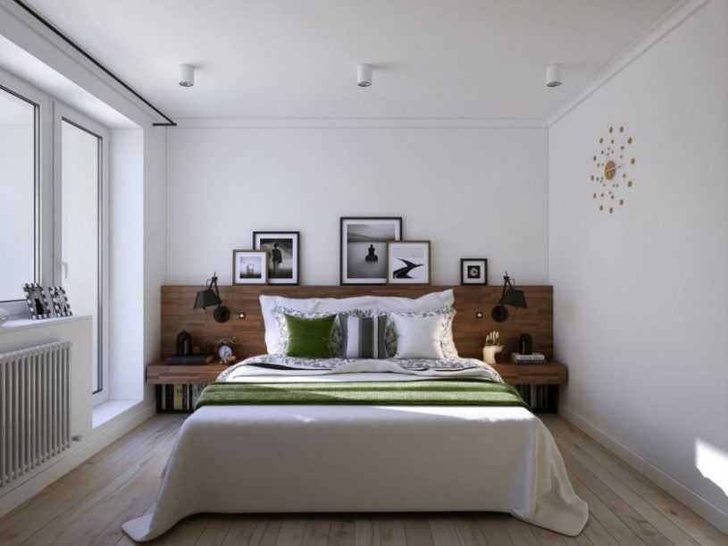 Для предметов, которые всегда требуются «под рукой» используйте навесные полки и узкие навесные шкафы. Часть можно разместить в изголовье кровати. Наша задача максимально разгрузить пол, так как это визуально добавит простора.