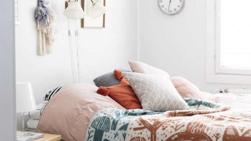 Одну из основополагающих ролей для формирования цельного образа спальни в скандинавском стиле играет разнообразный текстиль. Не стоит пренебрегать значимостью этого элемента декора.