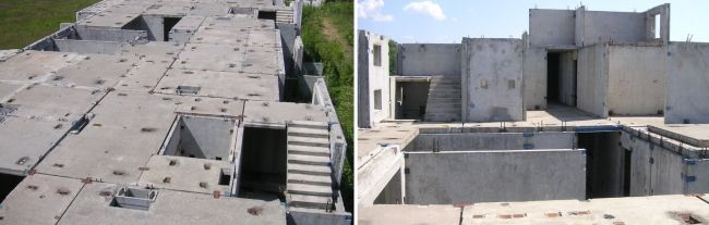 - внешние стены из трехслойного материала шириной 30-40 см, внутренние – железобетон 16-20 см в толщину;
