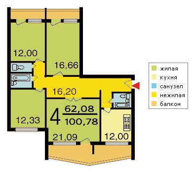 | 4-комнатная квартира | 91—109 | 54—60 | 11—16 |