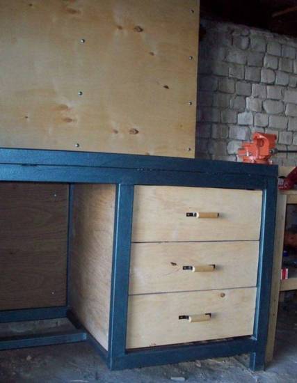 Основным элементом верстака является несущая конструкция, выполненная в виде рамы. Она обеспечивает жёсткость и прочность, принимает на себя все нагрузки и одновременно служит каркасом для тумб и выдвижных ящиков.